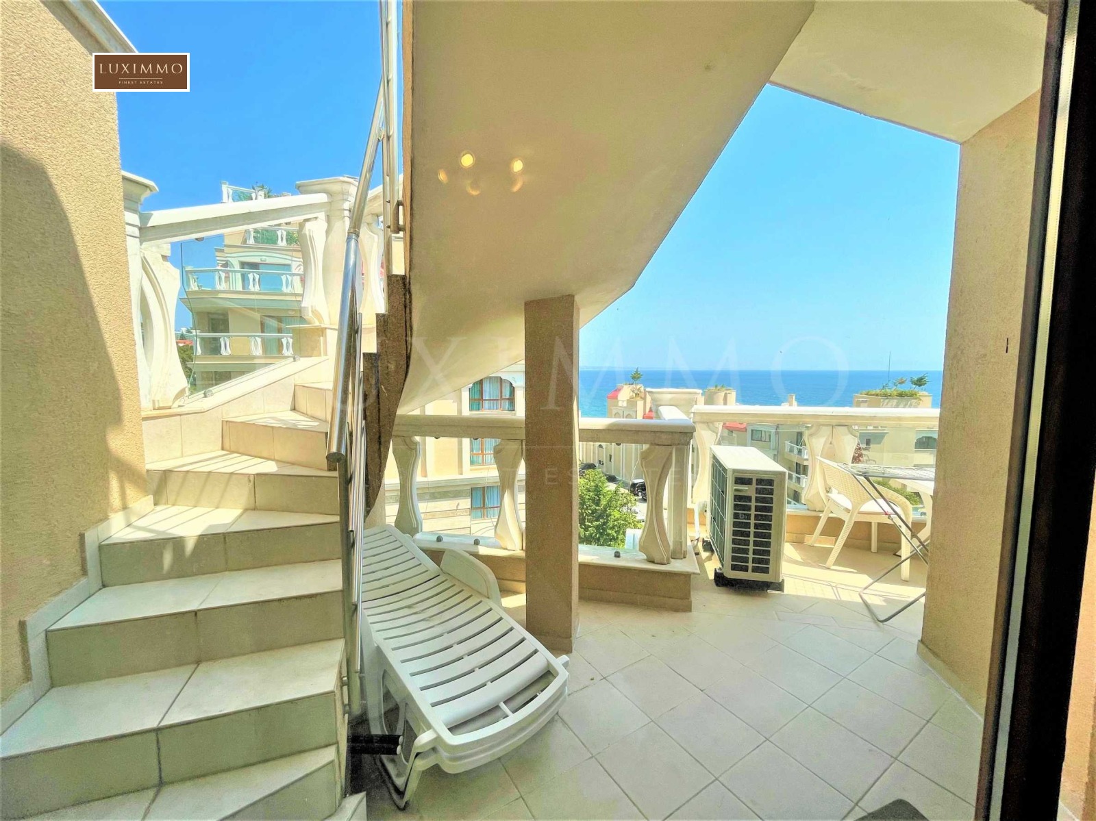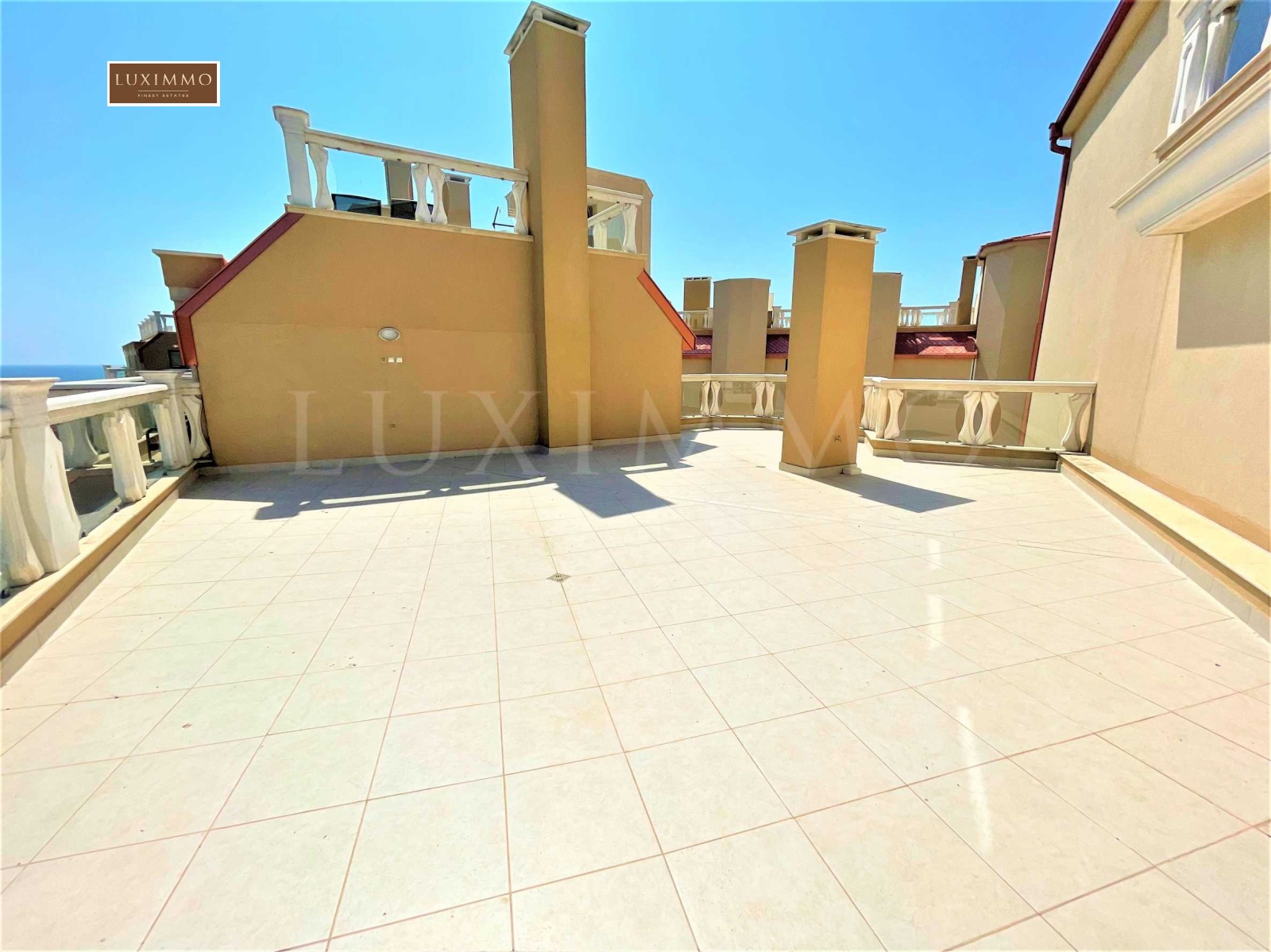 второ ниво - панорамната тераса за релакс от цели 85 кв.м, където може да се наслаждавате на невероятната морска гледка, както и да обособите собствен кът за отдих, има изводи за ток, два контакта и вода.