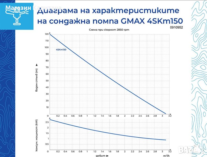 Сондажна водна помпа Gmax 4SKM150 е с мощност 1.1 kW, напор 99 м и максимален дебит 3.5 м³/ч. Подходяща е за изпомпване на чиста вода от сондажи. Има включени пулт и кабел 20 м. Корпусът на помпата е изработен изцяло от неръждаема стомана и месинг.