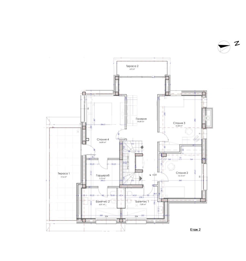 Втори етаж: коридор, баня с тоалетна, родителска спалня с дрешник и самостоятелна баня с тоалетна, две спални, втора баня с тоалетна, 2 тераси.