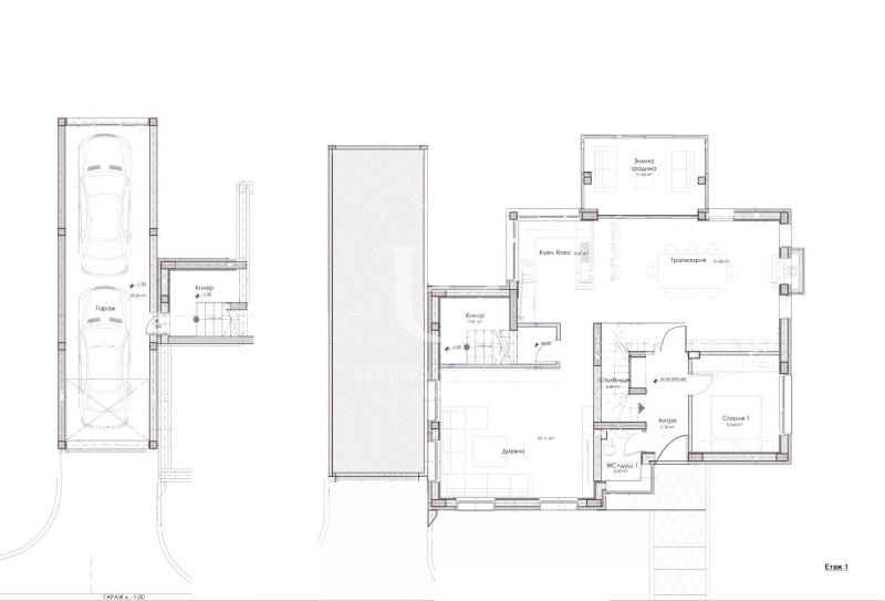 Първи етаж: антре, кухня с голяма всекидневна, спалня, баня с тоалетна, мокро помещение, зимна градина, гараж с топла връзка от къщата.