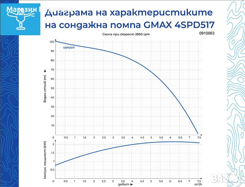 Сондажна водна помпа Gmax 4SPD517-1.5 е с мощност 1.5 kW, напор 106 м и дебит 7 м³/ч. Подходяща е за изпомпване на чиста вода от