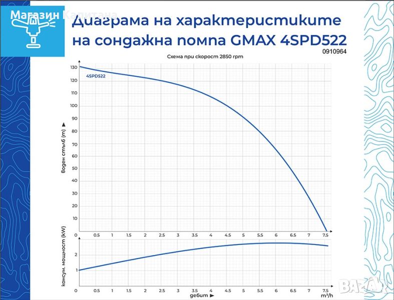 Сондажна водна помпа Gmax 4SPD522-2.2 е с мощност 2.2 kW, напор 138 м и дебит 7 м³/ч. Подходяща е за изпомпване на чиста вода от сондажи. Има включен пулт за управление и кабел с дължина 20 м. Максималната температура на течността е до 35°C. Корпусът на помпата е изработен от неръждаема стомана и месинг.