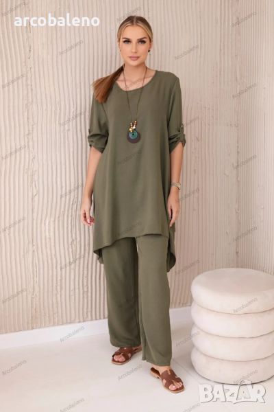 Италианският комплект от две части, състоящ се от разширена блуза и панталон е елегантен комплект, който придава чар и стил на всеки стайлинг. Разширената блуза придава фина женственост, като подчертава фигурата и в същото време осигурява свобода на движение. Класическата кройка на панталона го прави съчетан перфектно с елегантна блуза, създавайки едно цялостно и стилно цяло. Освен това висулката във формата на ключ е очарователен детайл, който придава оригиналност и характер на този комплект, създавайки хармонична композиция. Това е елегантен аксесоар, който подчертава уникалността и вниманието към детайла в целия стайлинг. Този италиански комплект е идеален за много поводи, от бизнес срещи до романтични срещи. Това е изискан вариант за хора, които ценят елегантността и комфорта в едно. Размерът е универсален и става за жени, носещи размер S, M или L.