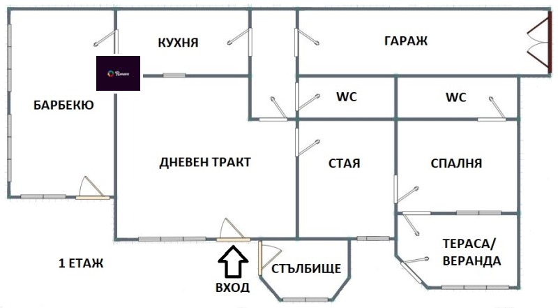 1 етаж: просторна всекидневна, кухненски бокс свързан с външната барбекю зона, баня с тоалетна за гости, 2 спални, едната от които със самостоятелен санитарен възел