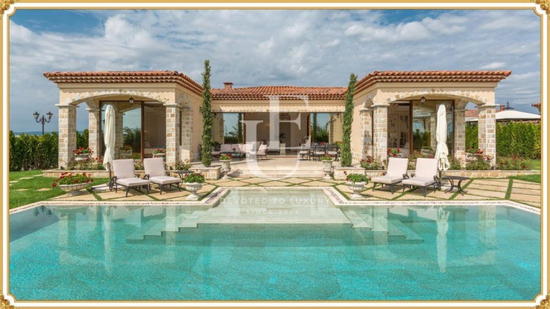 Unique Estates има удоволствието да Ви предложи една чудесно обзаведена къща в летния курорт Слънчев бряг. Концепцията на комплекса е да бъде едно уникално по своя вид селище на българското Черноморие, което да предлага не просто къщи за продажба или отдаване под наем, но и да предоставя огромен брой услуги на своите гости. Комплексът е богато озеленен и с поддържани общи пространства, неповторима архитектура и акцент върху детайла. В него има луксозен Спа център със закрит басейн и зимна градина, релакс зона, витаминен бар, парна баня, турска баня, сауна, джакузи и масажи. Ресторант-градина предлага голям избор от средизимноморски ястия и напитки, както и здравословна кухня, съобразена с изискванията на най-запалените почитатели на здравословната и био храна. Фитнес център, спортна зала за спининг, аеробика, йога и стречинг, 5 открити тенис корта, както и осветени футболно и баскетболно игрища ще могат да бъдат използвани в прохладните вечерни часове. Закрит тенис корт, детска спортна площадка с детски басейн, супермаркет, медицински център, аптека и просторна рецепция със зимна градина допълват списъка с предлаганите услуги. Обществената зона за рекреация и почивка ще е разположена на площ от 40 000.м?.