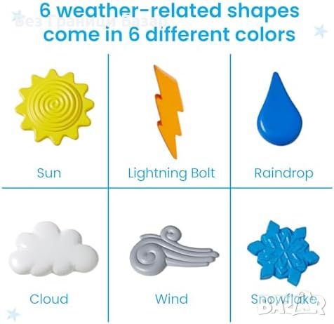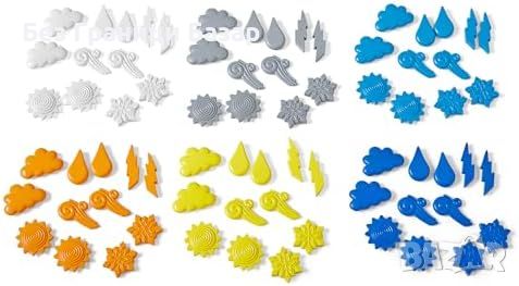 6 форми (слънце, облак, мълния, дъжд, вятър, сняг) в 6 различни цвята
