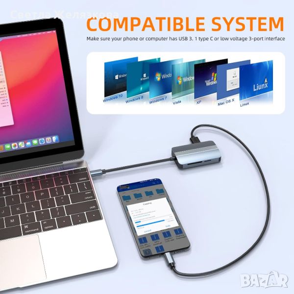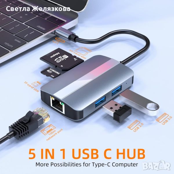 USB C ХЪБ 5 в 1: USB C хъбът с множество портове разширява USB-C порта до множество от 5 порта, включително USB 3.0, USB 2.0, RJ45 Ethernet порт и четец на SD/TF карти.
