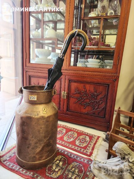 Стойка за чадъри/бастуни от мед с извита дъжка. Размери ф долу 23 см и ф горе 20 см, високо е 35 см. Цена 100 лв.