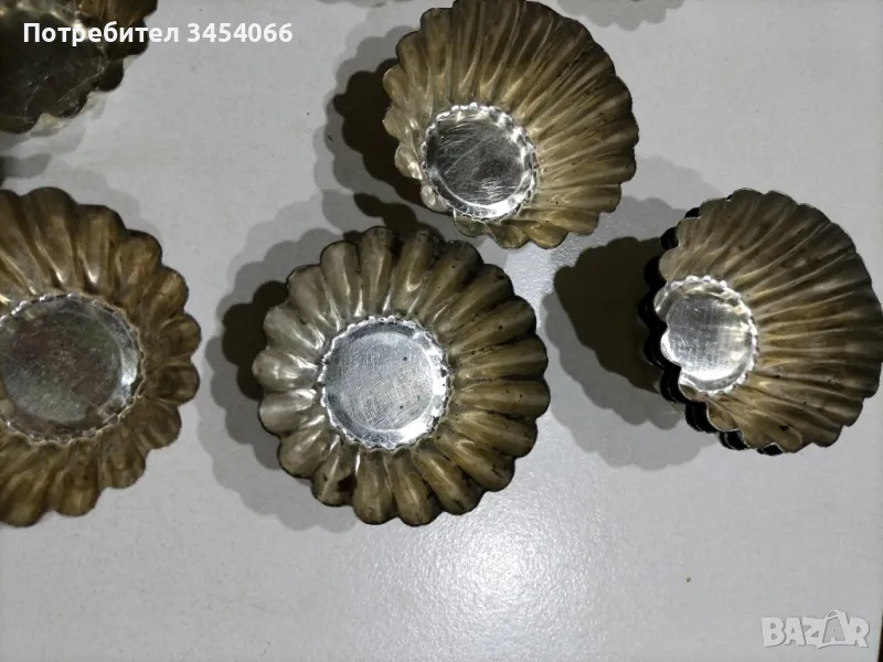 Стари формички за дребни сладки-15бр.Размери :дъно-3,3см и горен отвор - 6см диаметър. На места на някой е паднал цинка. Изпращам само по Еконт с право на оглед.