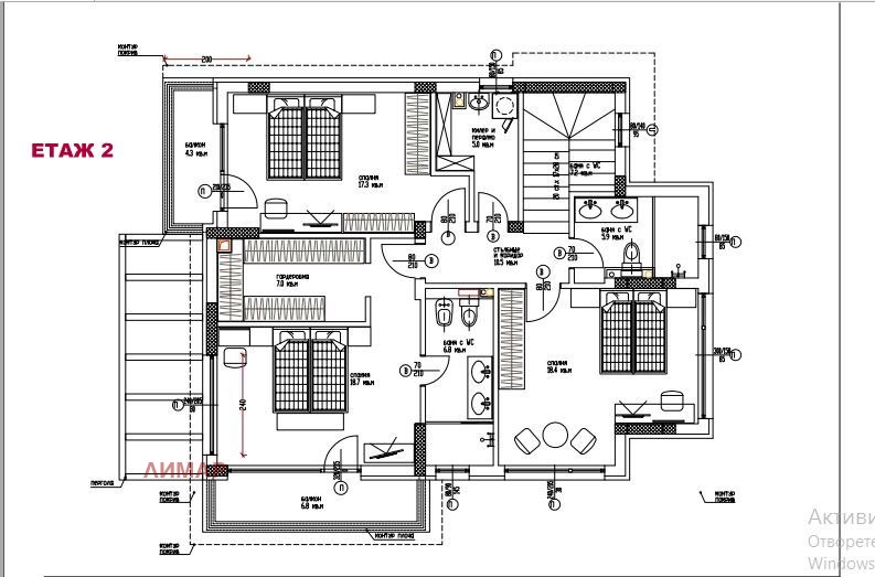 На етаж 2 с площ от 121 кв.м. ще са изградени коридор, родителска спалня от 18 кв.м. с прилежащи гардеробна и баня с тоалет с по 7 кв.м. всяко от помещенията и тераса, две спални по 18 кв.м. едната с балкон, баня с тоалет и перално помещение.