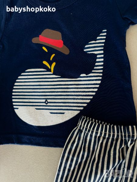 Комплект синьо китче- включва блузка с къса ръкав с апликация кътче, къси панталонки с бяло и синьо с ластик в кръста.