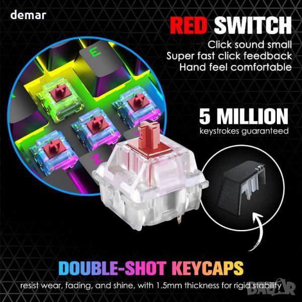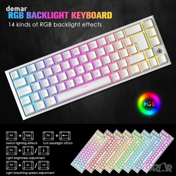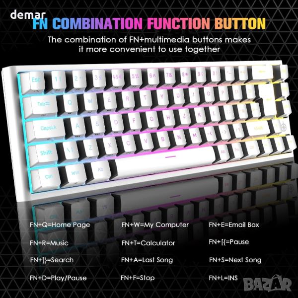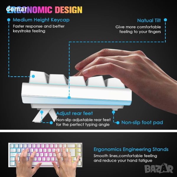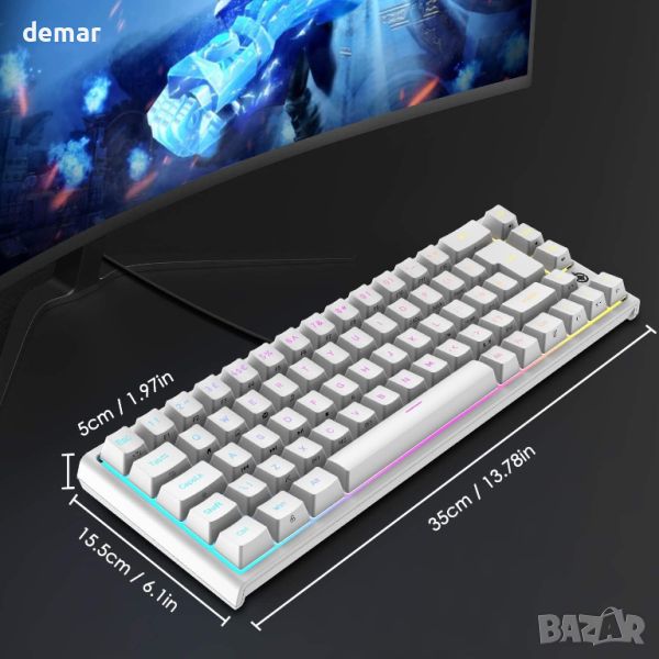Тази 60% мини клавиатура предлага подобрено пространство на работния плот и области за активност на мишката. Изработен от издръжлив ABS и метални панели, той разполага с подвижен Type-C кабел за удобство. Компактният размер е идеален за работа и преносимост. Той включва 14 RGB и 8 монохроматични режима на задно осветяване, с регулируема яркост и скорости на дишане за персонализирано игрово изживяване. Оборудван с висококачествени червени превключватели, той осигурява нисък шум, гладко натискане на клавишите и дълъг живот до 50 милиона натискания на клавиши. Всички 67 клавиша са анти-призрачни, с множество функционални клавиши, достъпни чрез Fn комбинации. Клавиатурата има регулируеми крачета, неплъзгащи се подложки за стабилност и е съвместима с различни операционни системи, включително Windows и ограничена поддръжка на Mac OS, подобрявайки ергономичния комфорт и намалявайки умората на ръцете.