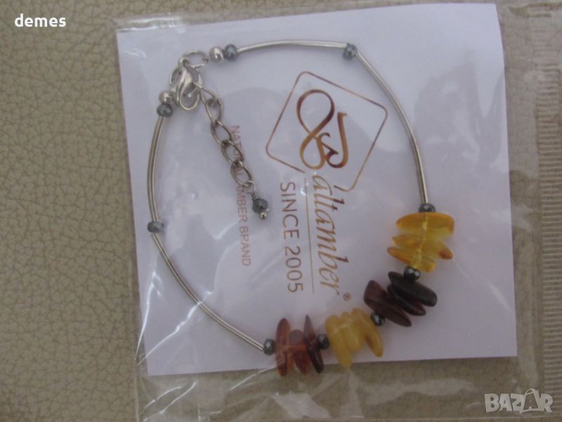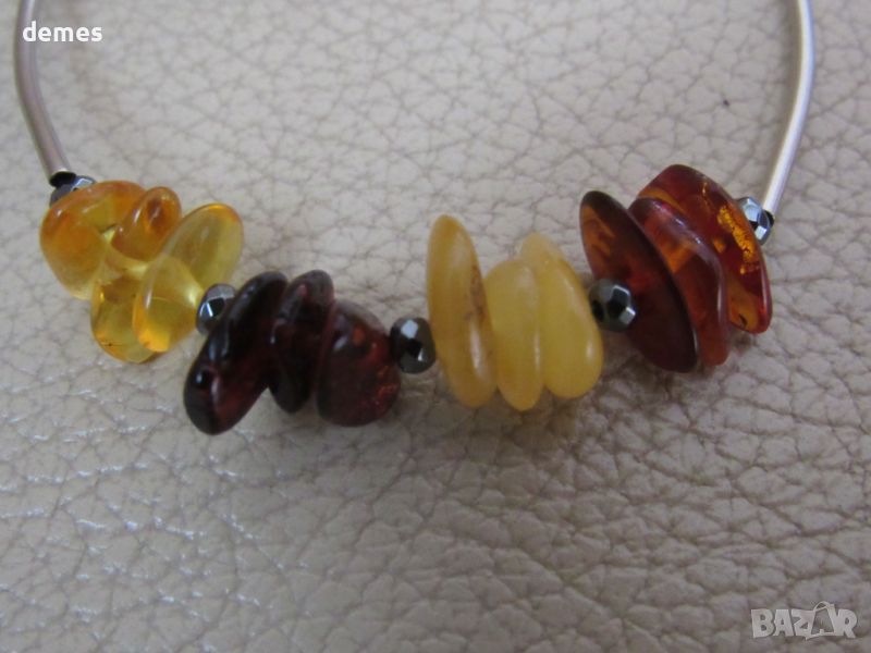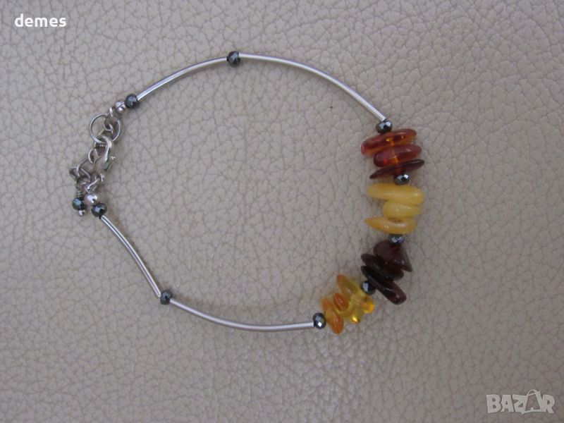 Елегантно дамска гривна от първокласен Балтиийски кехлибар и пластини от медицинска стомана.