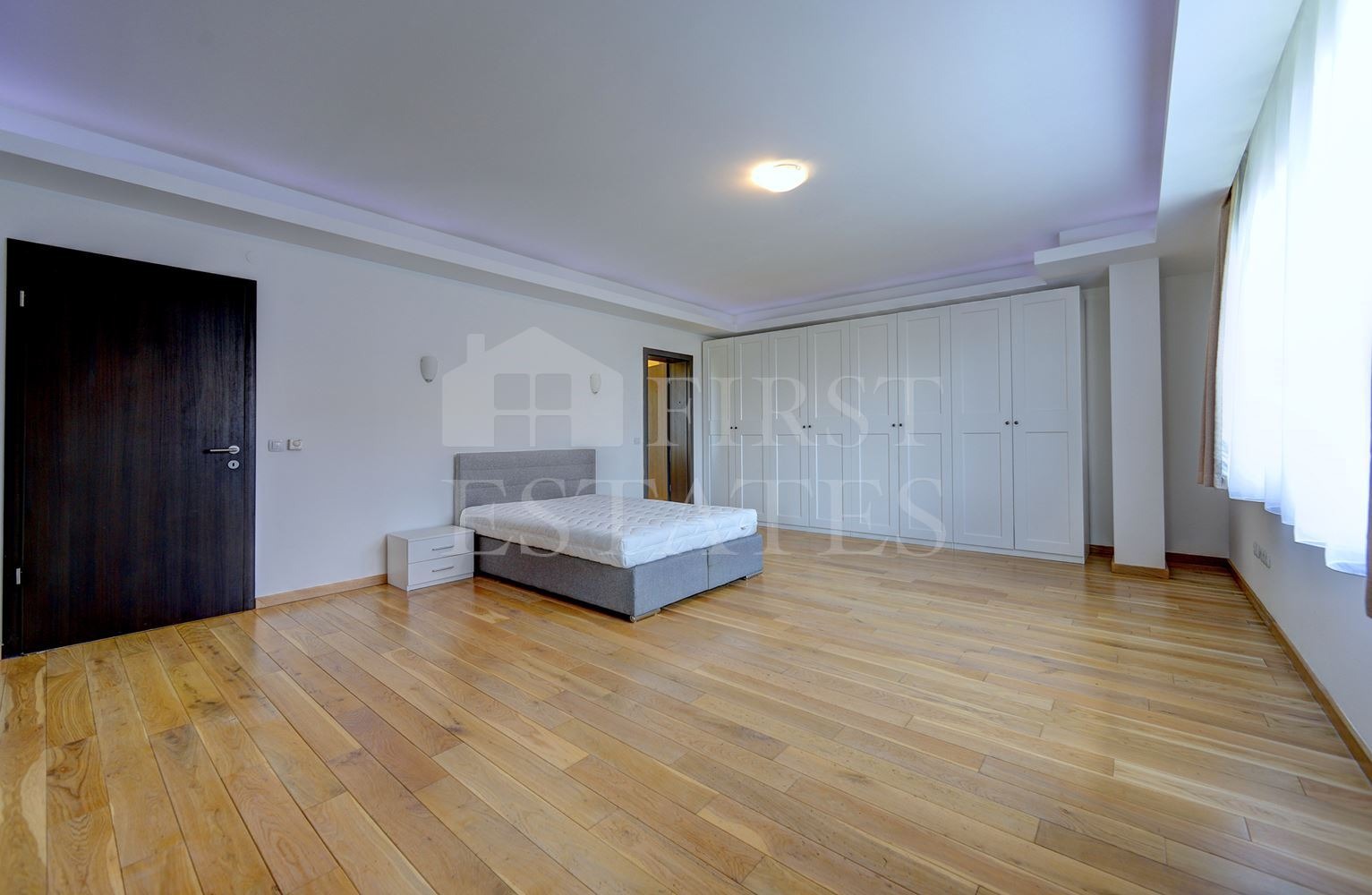 Къщата отговаря на всички съвременни изисквания за комфортно обитаване с широки и удобни помещения, спални с прилежащи бани, вградени гардеробни стаи, гаражи, достатъчно сервизни помещения. Къщата има зелено пространство затревен двор и декоративна растителност. Първи етаж има голяма всекидневна с изградена камина, тереса за виншно барбекю, кухня с вградена бяла техника Bosch, 2 стаи за гости, баня и килер.Втори етаж има 3 простони стаи, всяка със собствен санитарен възел.