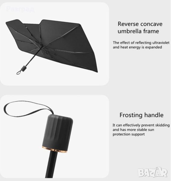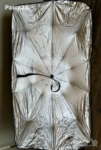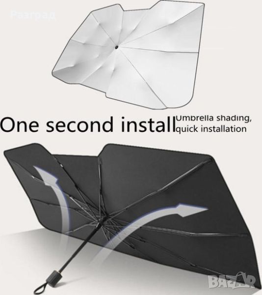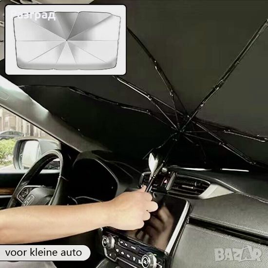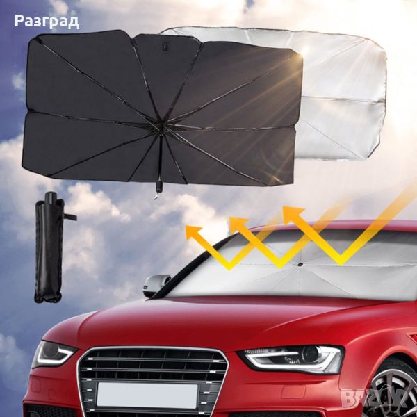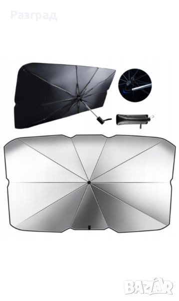 Чадър UV сенник за предно стъкло на автомобил. Пасва на повечето модели автомобили, включително седани, SUV и миниванове. Покрива цялото предно стъкло. Размери :115 Х 65см. Изработен от титаниев полиестер с високо ефективна топлоизолация и UV защитата, предпазваща интериора от стареене и обезцветяване. Лесен за използване, лесен за сглобяване и разглобяване - разгва се и се сгьва като