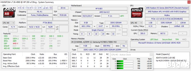 Процесор: AMD A8-7410 (4-ядра, 4-нишки, 2.20 - 2.50GHz, 2MB кеш)
