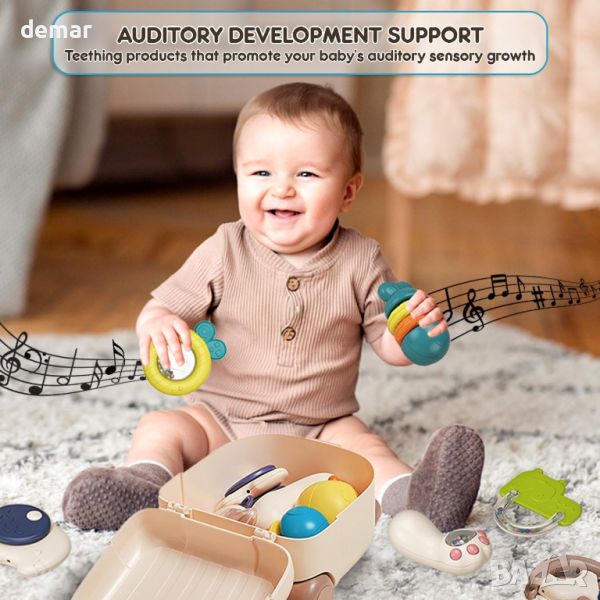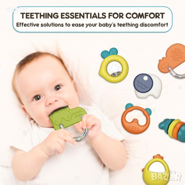 Ангажирайте сетивата на вашето бебе и подобрете фините двигателни умения с нашите живи пръстени за зъби и дрънкалки, предназначени да пленяват и забавляват. Тези играчки насърчават изследването на текстури, цветове и форми, като помагат на вашето бебе да развие координация и сръчност. Включеният издръжлив калъф за носене поддържа играчките организирани и достъпни за приключения в движение, което прави срещите и излетите без стрес. Изработени от висококачествени материали без BPA, нашите играчки осигуряват безопасна игра без вредни химикали. Насладете се на безпроблемно почистване с нашия лесен за почистване дизайн, позволяващ повече време за забавление и по-малко за поддръжка. Идеален за празненства, рождени дни и специални поводи, нашият първокласен комплект за зъби и дрънкалки предлага безкрайно забавление и подкрепа за развитието, което го прави перфектен подарък за родители и малки деца.
