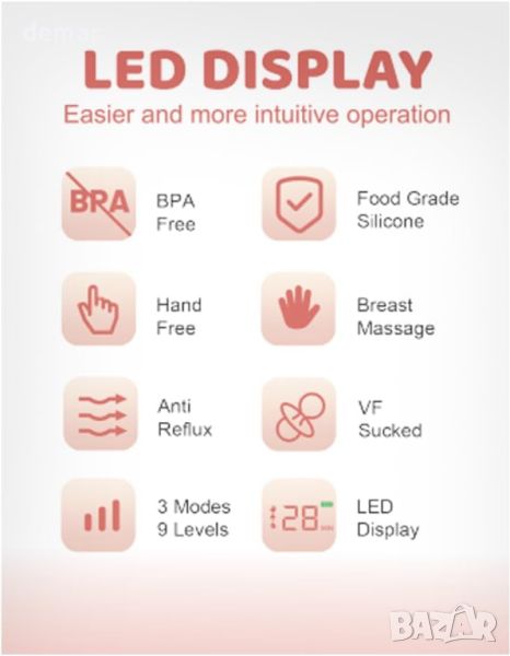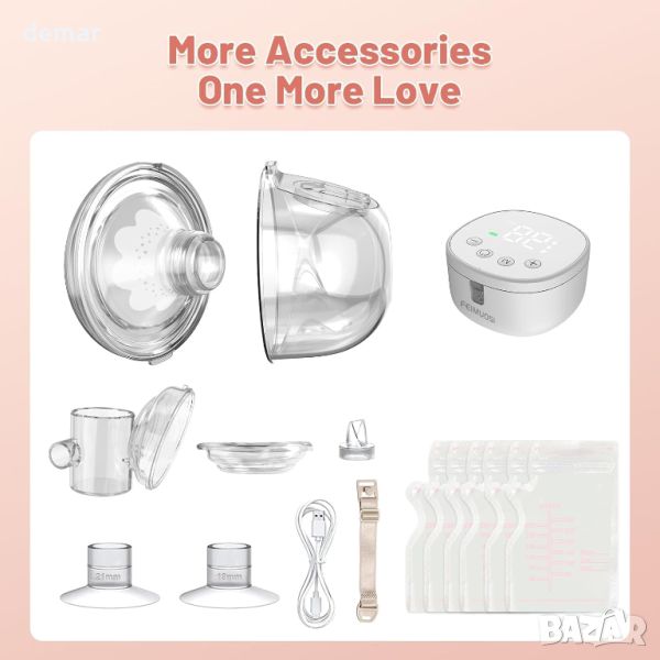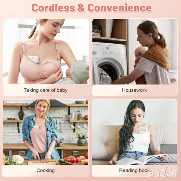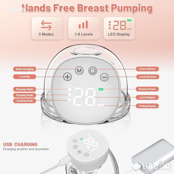 Електрическата помпа за кърма FEIMUOSI предлага удобство без ръце, позволявайки на майките да изпълняват няколко задачи без усилие, докато изцеждат мляко. Неговият сутиенен дизайн осигурява комфорт и гъвкавост по време на работа, пътуване или почивка. Помпата се предлага с три размера на фланеца (19/21/24 mm), за да се приспособи към различни форми на гърдите, изработена от силикон за хранителен клас за безопасност и щадяща кожата. С три режима (масаж, изпомпване, смучене) и девет нива на интензивност, той може да се персонализира за ефективно изпомпване. Батерията от 1200 mAh се зарежда чрез Type-C и издържа 150 минути за 5-6 сесии, с функции за автоматично изключване за безопасност. Работейки при по-малко от 40 dB, той е достатъчно тих за използване през нощта, без да безпокои бебето. LED дисплеят показва режим, ниво, време на използване и статус на батерията. Антирефлуксният дизайн предотвратява замърсяване, а комплектът включва различни аксесоари, като торбички за съхранение на мляко и регулируеми закопчалки за сутиен, което го прави цялостно решение за кърмещи майки.