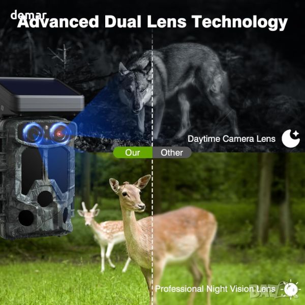 TC07 Wildlife Camera разполага с функция за нощно виждане на звездна светлина за жива фотография при слаба светлина, усъвършенствана система с двоен обектив за независима работа през деня и нощта, заснемане на 4K видео и 60MP изображения със сензор Sony IMX458. Той предлага слънчева енергия с панел от 5000 mAh и двойни опции за захранване, гарантиращи непрекъсната работа и екологичност. Камерата поддържа WiFi и Bluetooth свързаност с контрол на приложението за лесно управление и преглед. Усъвършенстваната видео компресия H.265 спестява място за съхранение, а цикличният запис предотвратява загубата на данни. Той включва 120° широкоъгълен обектив, персонализирани настройки, защита с парола, обхват на нощно виждане от 20 метра и инфрачервено активиране на движение, подходящи за различни приложения като лов, наблюдение на диви животни и домашна сигурност.