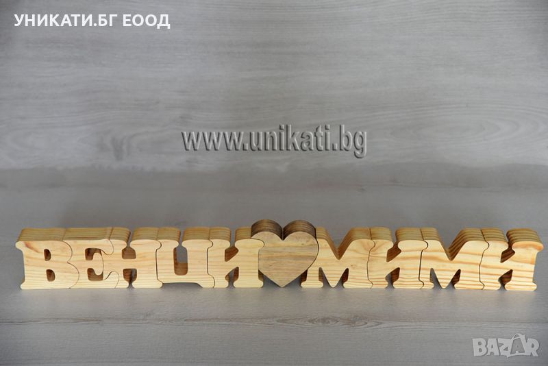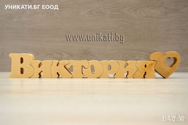 Изработка на имена от дърво по поръчка с букви тип пъзел. Можете да поръчате името, което желате и ние ще го изработим. Освен букви, пъзелът може да има и други елементи, които са подходящи за човека, на коогото ще се подарява, като: сърце, детелина, лого, и др. Може да има и гравиран текст, пожелание за рожден ден, дата от годишнина и др.