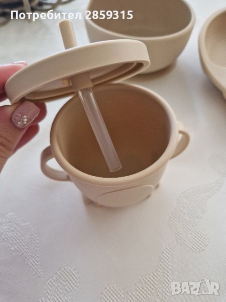 Комплект за хранене за деца / за бебета. Изработен от висококачествен силикон с естествен бамбук (дръжките на лъжичката и виличката са бамбукови). Комплектът включва чиния с разделения за различни ястия, плодове, зеленчуци и т.н.; вилица, лъжица, купичка за каши, кус кус, пюрета и супи, силиконов лигавник, супер удобна неразливна чаша с капаче със сламка. Съдовете са подходящи да се мият както на ръка, така и в съдомиялна. Издръживи са и на микровълнова фурна. Цветът на комплекта е слонова кост - към бежево. Подходящ както за момичета, така и за момчета. Комплектът е чисто нов, дори не съм го мила. Просто е дублиран подарък.