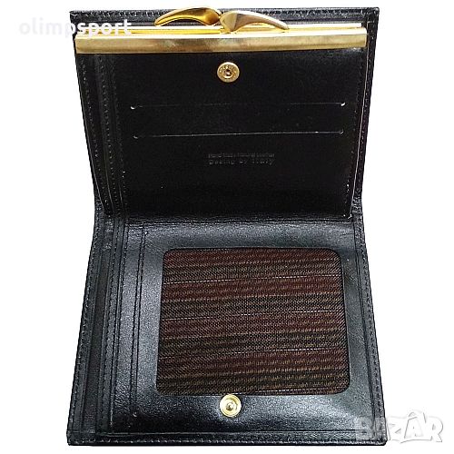 Дамско портмоне от естествена мека кожа в черен цвят. Две отделения за банкноти, слотове за карти и визитки, място за документи и голям монетник с клипс. Портмонето се затваря от двете страни посредством клипс.