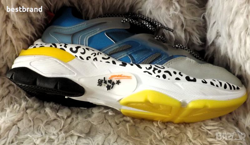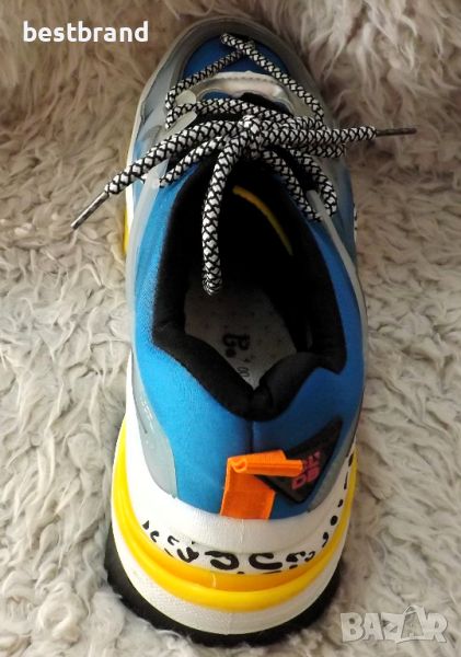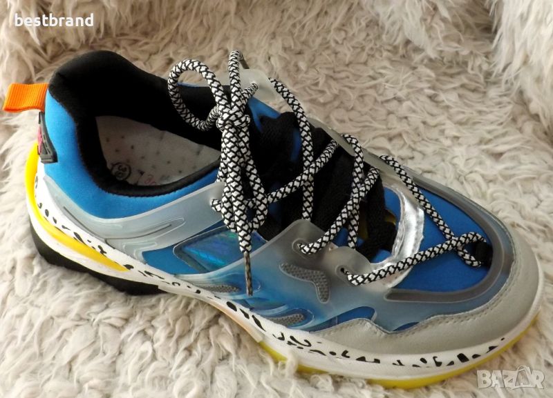 Дамски , цветни маратонки, с двойни връзки , изработени от неопрен. Това е материята, от която правят водолазните костюми, не пропускат вода. Предната и задната част на маратонката е подсилена от кожа, за по-голяма здравина на модела , а стелката е дишаща. Височина на подметката в предната част- 5 см., а към петата - 6 см. Моделът е умален с един размер. Стелката на 39 номер е 24 см., толкова,колкото трябва да е на 38 номер.