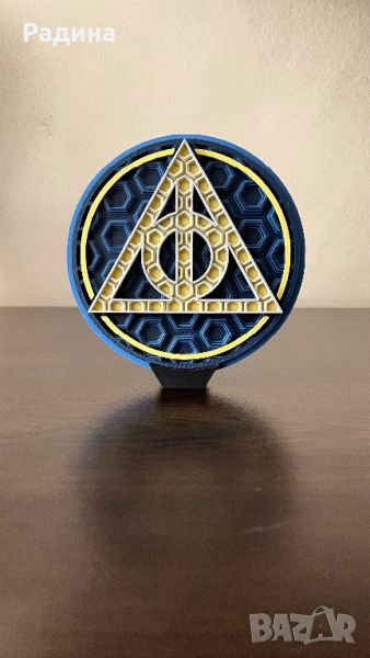 Комплектът включва и емблематичния символ на Даровете на смъртта, съчетаващ Бъзовата пръчка, Камъкът на възкресението и Невидимата мантия. Тя е символ на едни от най-мощните артефакти в магьосническия свят.