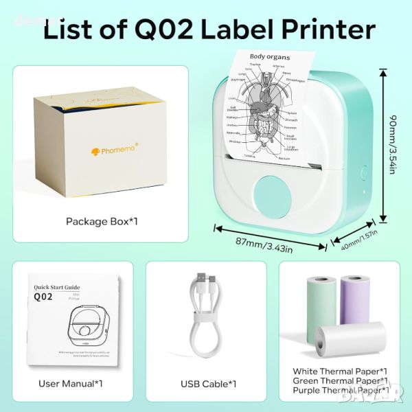 Пакетът мини принтер за етикети Q02 включва 1 зелен принтер Q02, 3 ролки 53 mm етикети (бели, зелени, лилави), кабел за данни и ръководство за употреба. Този преносим и лесен за употреба принтер, тежащ 200 g и с размери 87 x 90 x 40 mm, се свързва чрез Bluetooth с вашия телефон и работи чрез приложението Phomemo. Той използва технология за термичен печат, елиминирайки необходимостта от мастило, тонер или ленти, което го прави икономичен и екологичен. Приложението Phomemo предлага множество шаблони за създаване на персонализирани етикети, идеални за различни нужди, а отпечатъците могат лесно да бъдат изрязани във всякаква форма или размер. Принтерът Q02 е обмислен и уникален подарък за насърчаване на творчеството, идеален за деца, семейство, съученици, учители и ентусиасти „направи си сам“.