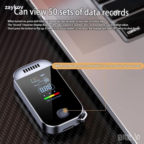 【USB зареждане и проверка на записите от тестовете】 Алкотестерът се предлага с USB кабел за зареждане, който може да се зарежда веднъж за около 500 теста без батерии и е екологичен и може да се използва многократно. Актуализираният алкотестер може да показва последните 50 набора от тестови данни.