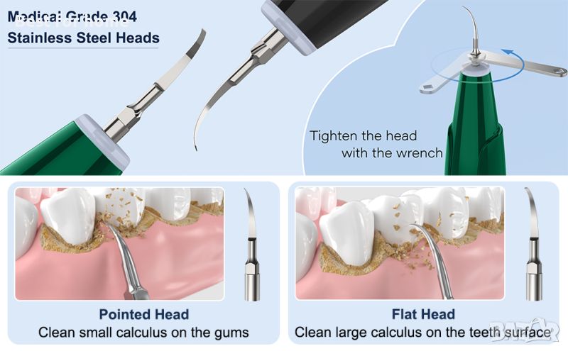 Два вида глави – заостреният връх е подходящ за почистване на малки петна по венците, плоският връх се използва за почистване на голям зъбен камък по повърхността на зъбите.