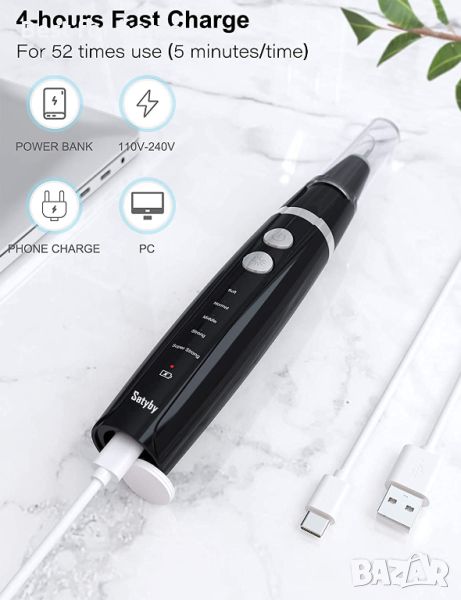 A3: Sonic потъмнява лака за зъби или геловете за избелване на зъби чрез пулверизиране при висока температура. Поради това не препоръчваме използването на това устройство с полиращи средства за зъби или други лепила за избелване на зъбите. и можете да избършете тези черни остатъци от зъбите си с хартиена кърпа или четка за зъби.