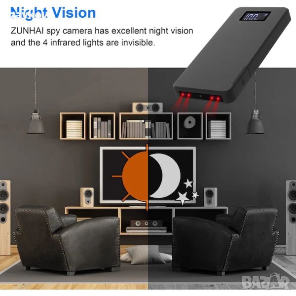 скрита камера с голям капацитет. Формата на скритата камера ZUNHAI е power bank. Може да се използва не само като powerbank, но и като незабелязана скрита камера. Има 4K пиксели с висока разделителна способност и вградена 10000mAh акумулаторна литиева батерия, която може да осигури около 40 часа видеозапис и поддържа зареждане по време на запис.