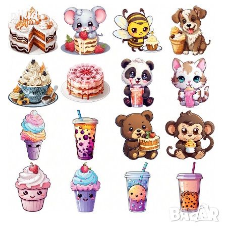 55 бр Десерти лакомства напитки със животни самозалепващи лепенки стикери за украса картонена торта → Обява 46563401