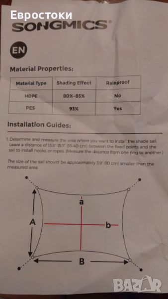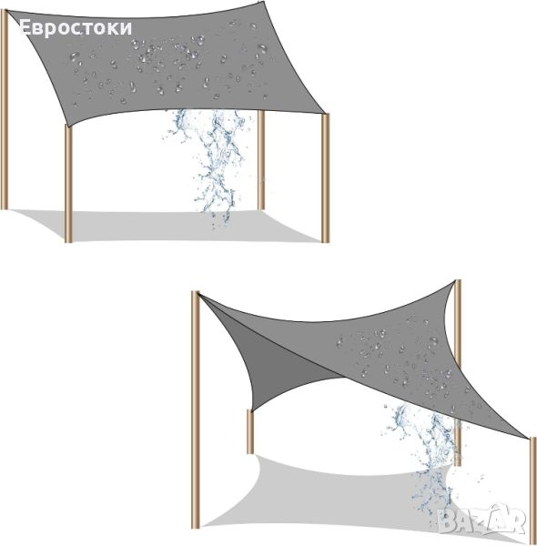 ЗАБЕЛЕЖКИ: Разстоянието между 2 пръта трябва да е с 35 до 100 см по-дълго от дължината на платното. Размерите на слънчевото платно са от единия D-пръстен до другия, когато е напълно опънат. Толеранс на размера: прибл. +/- 5%. Сянката е по-малка от размера на платното.