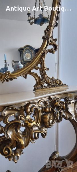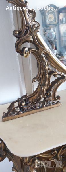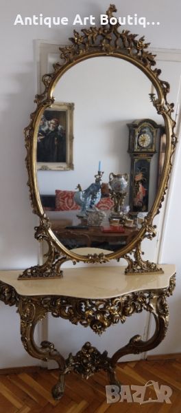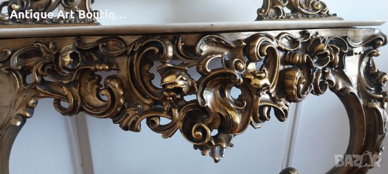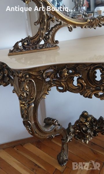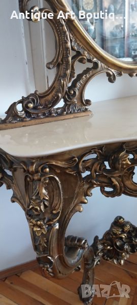 Старинна Италианска конзола с огледало в стил Сили изработка смола с позлата и мраморен плот размери 110/42см,кристално огледало 135/80см обща височина 225см