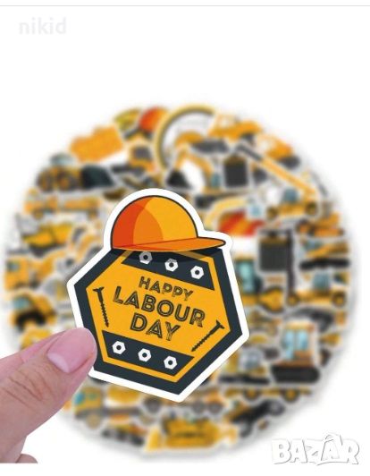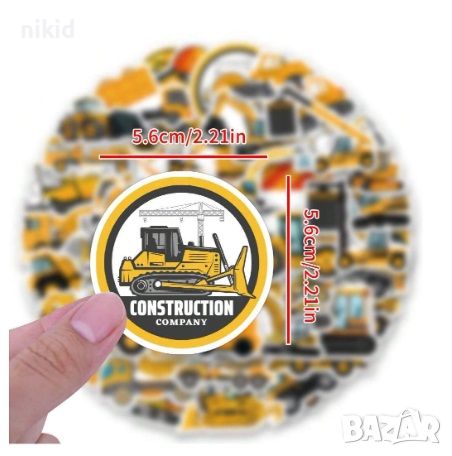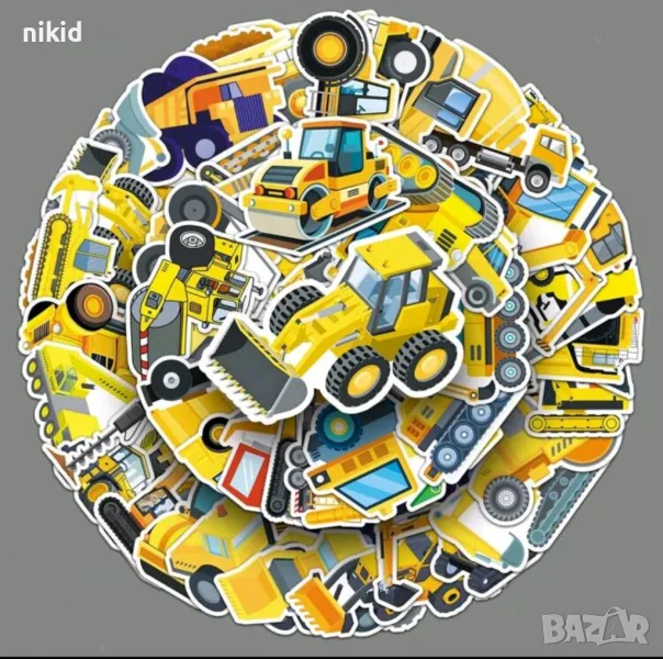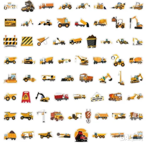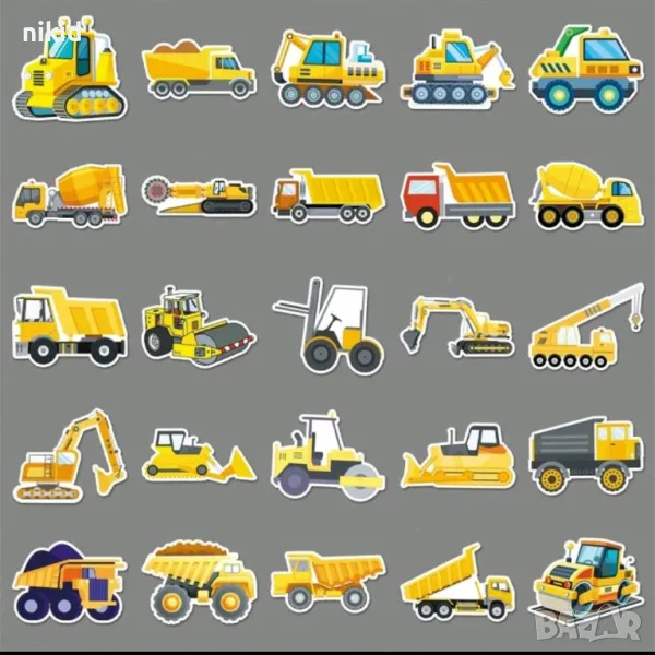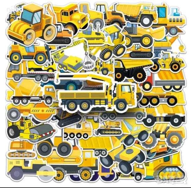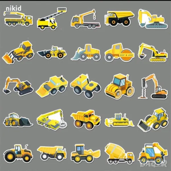 50 бр Багер Камион строителни машини самозалепващи лепенки стикери за украса декор картонена торта → Обява 46564754