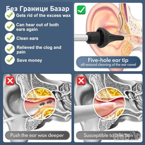 Безопасно почистване на ушите у дома: Нежна и ефективна система за промивка за премахване на ушна кал, мръсотия и остатъци, подходяща за възрастни и деца.