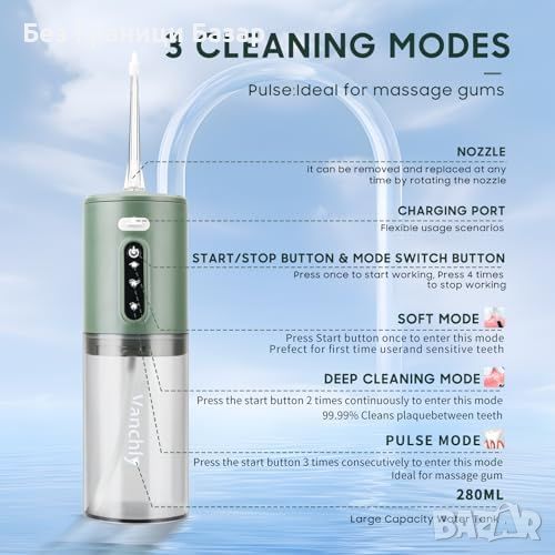 Професионален воден иригатор: 1400-1600 пулса/минута, 60-90 PSI налягане, премахва 99.9% от плаката.