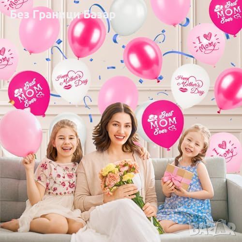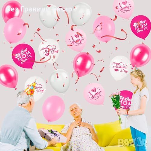 Пакет съдържа: 15 бр. балони с надпис за Деня на майката, 5 бр. розови, 5 бр. светло розови, 5 бр. бели балони и лента за балони.