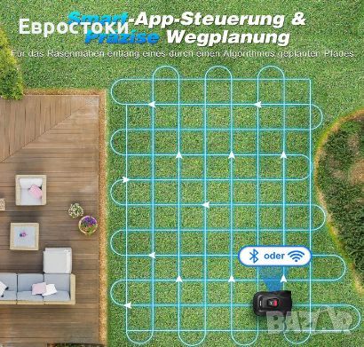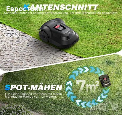 Управление на зони. Управлявайте грижата за моравата си дистанционно с помощта на приложението Handwise чрез 2,4 GHz Wi-Fi/Bluetooth връзка. Получавате пълен контрол над вашата градина. Можете също така да настроите зони за ограничаване и да избирате между различни режими на косене (зоново косене/точково косене/косене по ръбовете), за да отговарят на всички изисквания на вашата градина. Интелигентното препоръчване на планове за косене също елиминира необходимостта от ръчно организиране на вашата работа по косене на трева. Идеално за тревни площи до 500 m²!