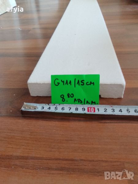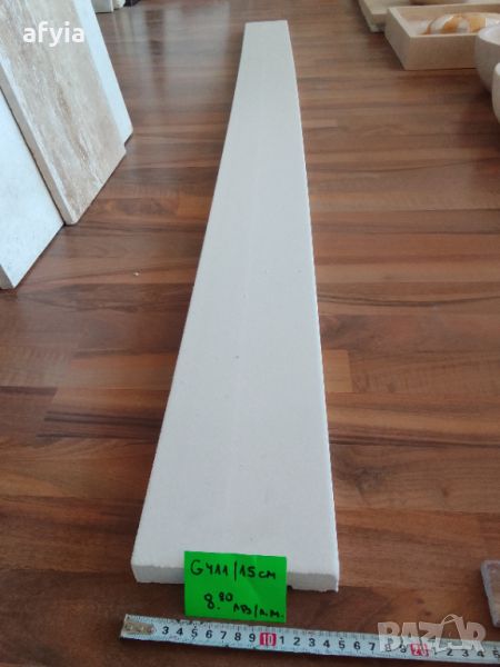 G-411/15 cm - Модел като плоска дъска без орнаменти, широчина 15 см, дебелина 3 см. Може да се използва около врати и прозорци и като и като разделител между етажи. Цена: 9,00 €1 (7,60 лв) с ДДС за профил с дължина 2 м. Има наличност.