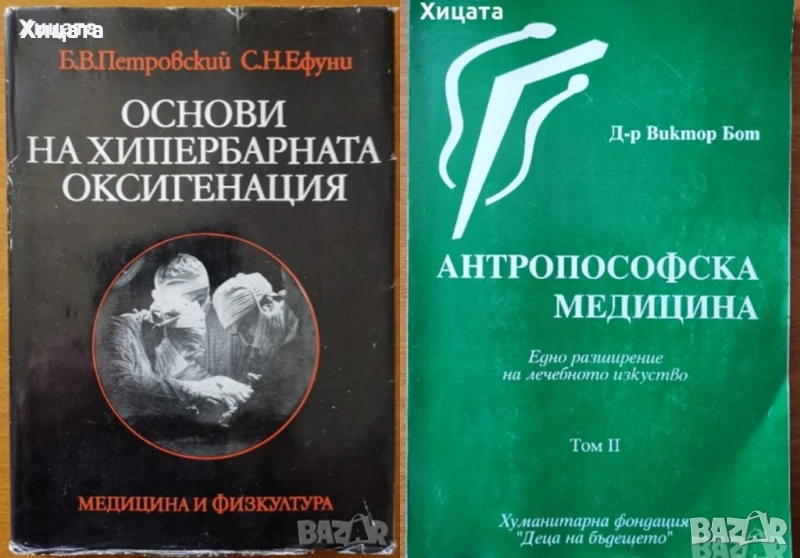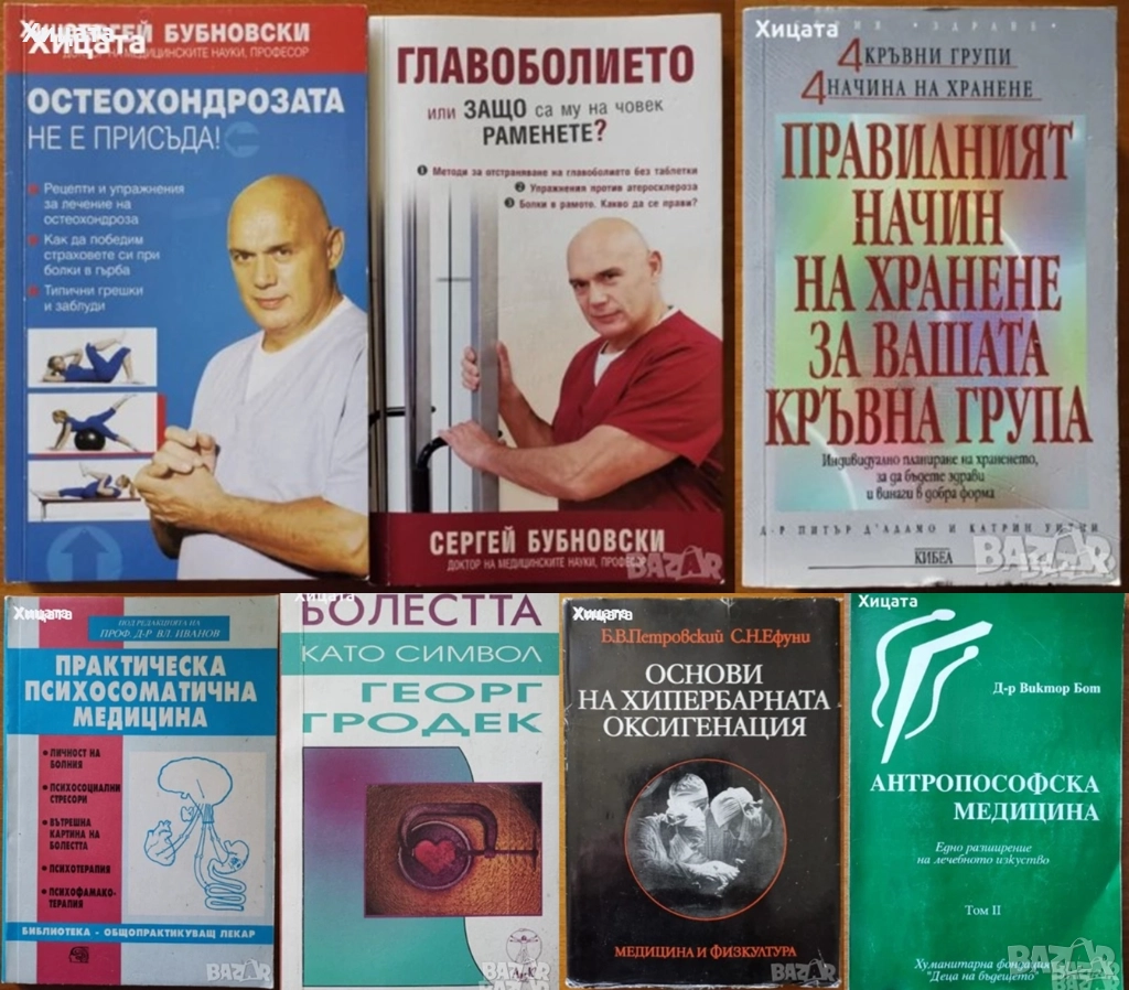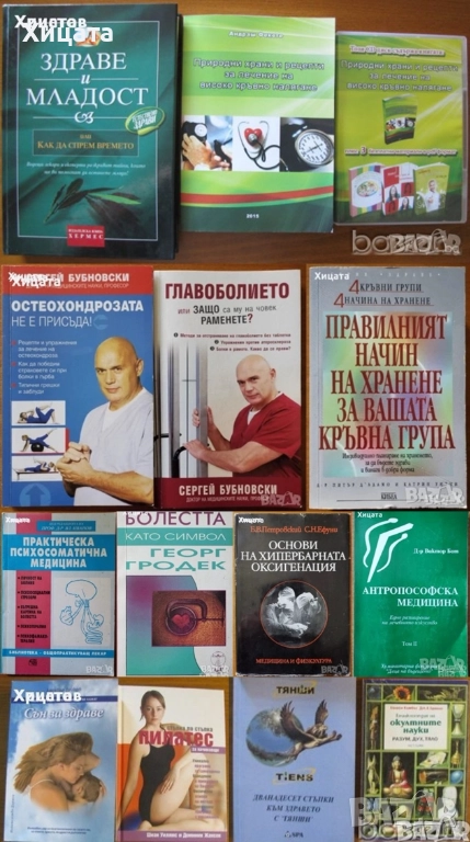 Болестта като символ.Очерци по психосоматика,Георг Гродек,ЛИК,2000г.224стр. - 80лв.Основи на хипербарната оксигенация,Б.В.Петровский,С.Н.Ефуни,Медицина и физкултура,1979г.332стр. - 70лв Антропософска медицина.Том 2.Едно разширение на лечебното изкуство,Виктор Бот,Алтея,2000г.192стр. - 70лв Остеохондрозата не е присъда!,Сергей Бубновски - 10лв. Главоболието,Сергей Бубновски - 10лв. Подчертан текст! Здраве и младост или как да спрем времето,Под редакцията на Едуард Клафлин ,Хермес,2000г.432стр. - 60лв.Природни храни и рецепти за лечение на високо кръвно налягане ,Андраш Фекете,2015г.358стр.бонус диск с 3книги - 50лв. Правилният начин на хранене за вашата кръвна група,Питър д'Адамо, Катрин Уитни,Кибеа,2013г.552стр.Отлична с леки забележки! - 35лв Сън за здраве,Здравко Райков,Изд.Дармон,2007г.550стр. - 25лв. Дванадесет стъпки към здравето с "Тянши",С. А. Батечко и Колектив,Изд.SPA,2003г.306стр. - 25лв. Енциклопедия на окултните науки. Част 1: Разум, дух, тяло,Ейлийн Камбъл, Дж. Х. Бренан,Абагар Холдинг,1996г.320стр. - 50лв. Стъпка по стъпка.Пилатес за начинаещи,Шиан Уилямс и Доминик Жансен,Коала прес,2010г.96стр. - 25лв.Домашна енциклопедия. Плодолечение и козметика,Веселин Денков, Румяна Денкова,Ведрина,1993г.352стр. - 30лв. Горските плодове - храна и лечебно средство,Борис Мичев, Алипи Найденов, Соня Чортанова, Тодор Малинов,Земиздат,1983г.376стр. - 25лв. Урината като лекарство,Кармен Томас,Репортер,2000г.216стр. - 25лв. Даоски лечебни жестове,Емма Гоникман,Аливго,2001г.203стр. - 30лв. Срещи с отвъдното,Лиана Антонова,Редакция 6 плюс,1991г.156стр. - 30лв. Нова лечебна наука,Луи Куне - 30лв. Науките на първата човешка раса.Ръководство по астрология, френология, хиромантия,Николай Дойнов,Роял-77,448стр. - 60лв. Лечение с чакрите,Синди Дейл,Аратрон,2000г.440стр. - 70лв.