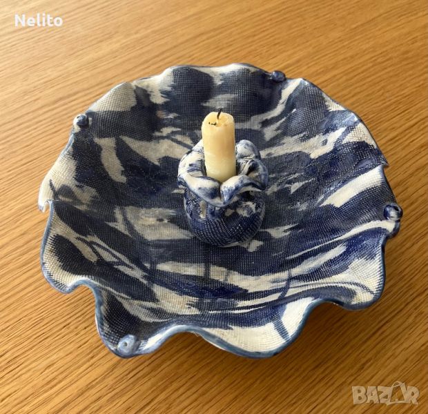 Керамична купа в синьо-бяло , грапава с преливащи нюанси и свещник в същия стил. Купата е с диаметър 22см и височина 6см. Свещникът също е висок 6см. Свещта е сложена само за да се добие представа за големината на отвора на свещника.