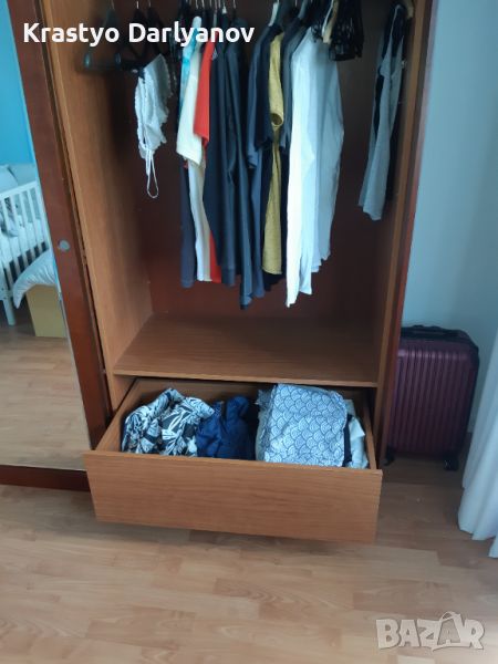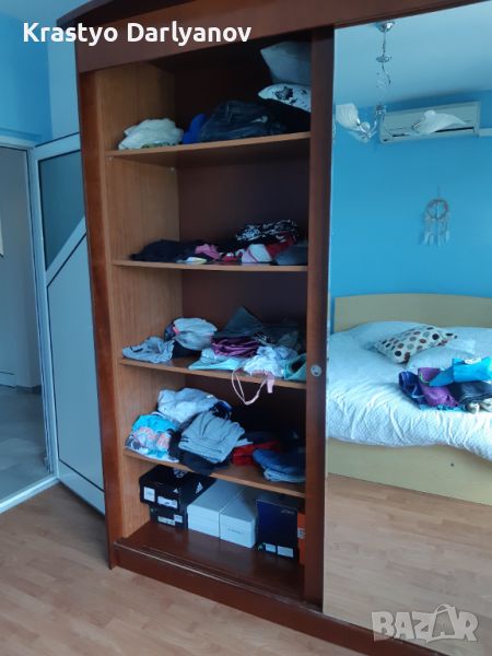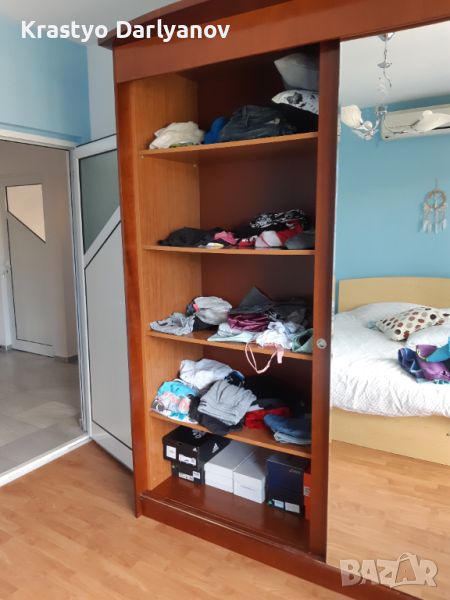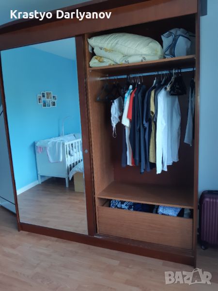 Гадероба е правен по поръчка от черешово дърво. Качествен и масивен е. Има монтирани допълнителни рафтове в лявата част (няма ги на снимките), които могат да се демонтират при желание.