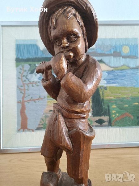 Прекрасна ръчно изработена масивна дървена фигура ,,Момче с флейта,, Изработена от цяло парче дърво, без снадки и лепено ! Височина - 40см.