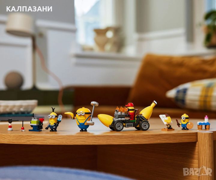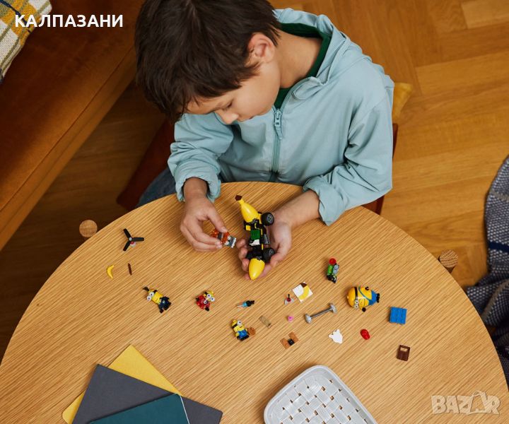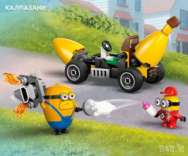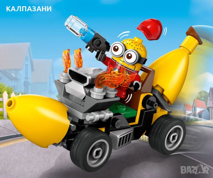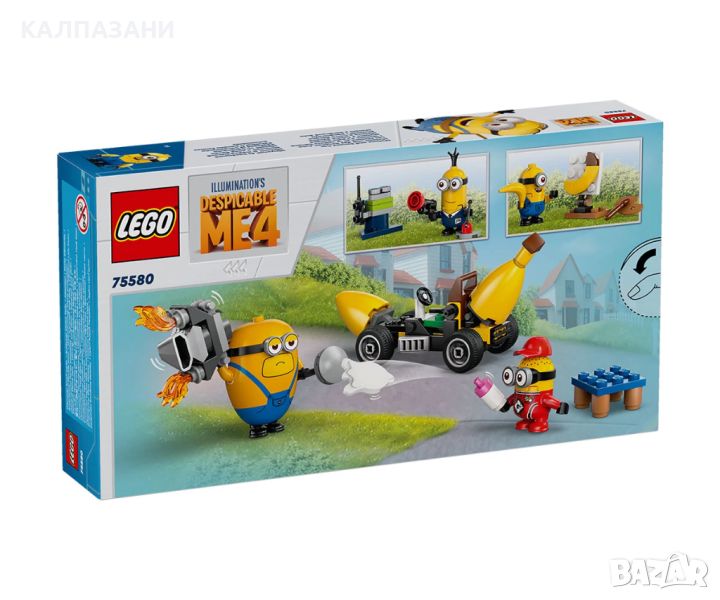 Зарадвайте фен на миньоните с комплект LEGO® Despicable Me 4 Миньони и кола банан (75580). Тази творческа играчка включва 4 миньони, малка кола и аксесоари. Тя е забавна филмова играчка за момчета и момичета на възраст над 6 години от Аз, проклетникът 4 на Illumination. Търсите комплект LEGO, малка играчка или забавен подарък с миньони? Разгледайте колата банан на миньоните с шофьорско място и свалящ се двигател. Играчката кола се предлага с 4 миньони и аксесоари. Мега миньонът Дейв може да вдигне двигателя в едната ръка и лост за щанга в другата. Мел рисува картина на банан, а таен агент миньон Тим от АЗЛ долита с въртящи се перки на главата и дистанционно управление в ръка. Работната му станция, пълна със специални инструменти, включително рентгенови очила, е на земята. Миньонът монтьор Рон отговаря за пелените до масата за преповиване. Той е напълно екипиран, включително с пистолет за изхвърляне на мръсни пелени. Строителите могат да се забавляват и в приложението LEGO Builder, където могат да увеличават и завъртат комплектите.