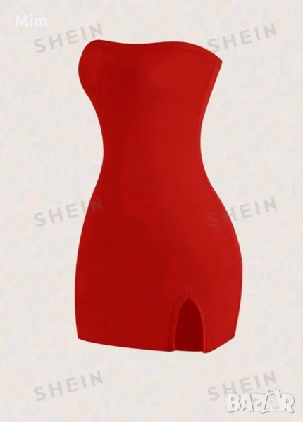 Ярко сатенена къса рокля в предната част над бедрото е с малка цепка, над бюста с ластик, закопчаването е отзад с цип. гръдна от 40 до 53 см едностранно, талия 45 см едностранно, ханш 55 см едностранно ,дължина от бюста 71 см Нова в опаковка.