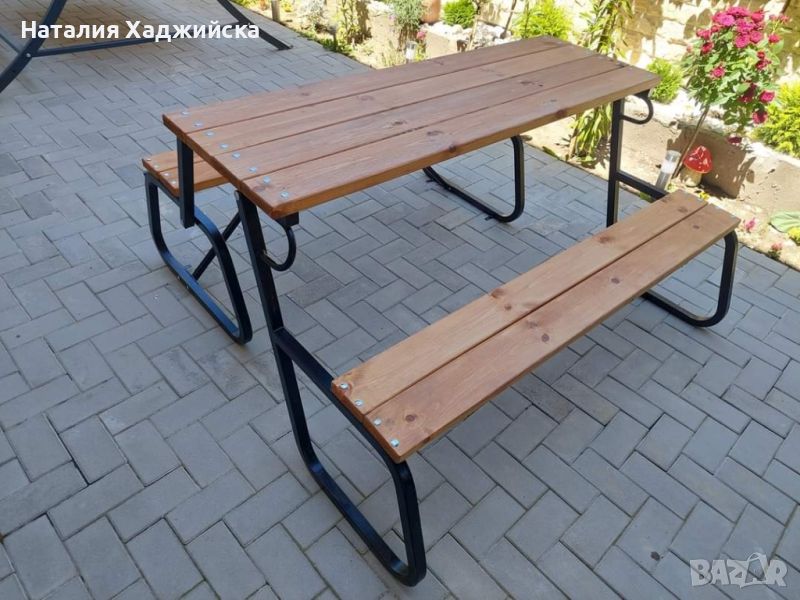 Комплектът се сгъва до една пейка. От пейка се превръща в маса с две пейки.
