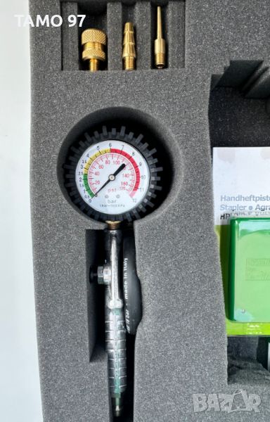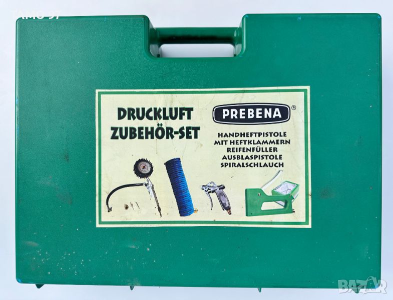 Продавам чисто нов комплект на марката PREBENA състоящ се от ръчен такер със скоби, спирален маркуч, пистолет за обдухване, пистолет за помпане на гуми, три броя дюзи за различни приложения и оригиналния куфар за транспортиране. Немско производство внос от Франция. Пращаме с опция преглед и тест с куриерска фирма еконт, може и лично предаване за гр. Шумен.